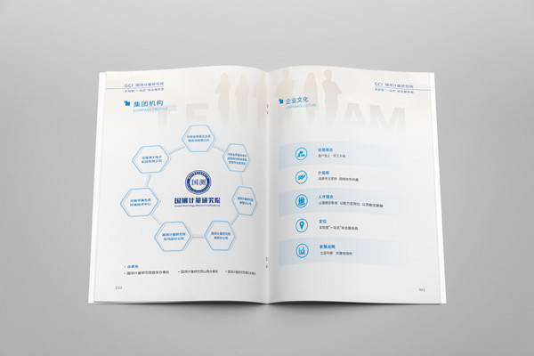 打開畫冊(cè),首先映入眼簾的是目錄,我們以測(cè)量尺為輔助圖形,隱喻其行業(yè)屬性,第三張圖是集團(tuán)機(jī)構(gòu)與企業(yè)文化,設(shè)計(jì)公司常用的就是圖表形式呈現(xiàn)其集團(tuán)的機(jī)構(gòu),而我們墨香設(shè)計(jì)不走尋常路,勇于創(chuàng)新,采用特別的立體的圖文結(jié)合方式呈現(xiàn)出來(lái),且企業(yè)文化部分的設(shè)計(jì)手法則層次分明,加以小圖標(biāo)的修飾,使其更具檔次,同時(shí)又弱化了其嚴(yán)肅氛圍,可是說(shuō)兩者的融合相當(dāng)協(xié)調(diào),這正是設(shè)計(jì)師設(shè)計(jì)專業(yè)度的體現(xiàn)。